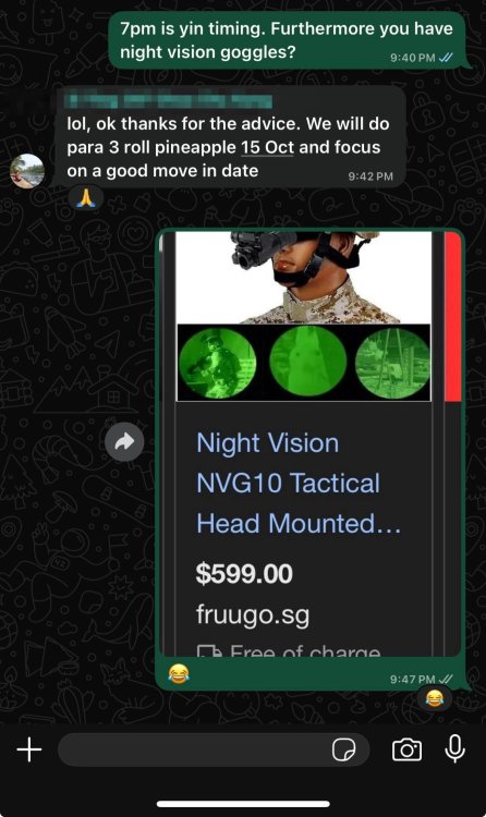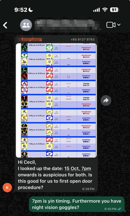 Hi Cecil, I looked up the date: 15 Oct, 7pm onwards is auspicious for both. Is this good for us to first open door procedure? 7pm is yin timing. Furthermore you have night vision goggles? - Cecil Lee lol, ok thanks for the advice. We will do para 3 roll pineapple 15 Oct and focus on a good move in date
