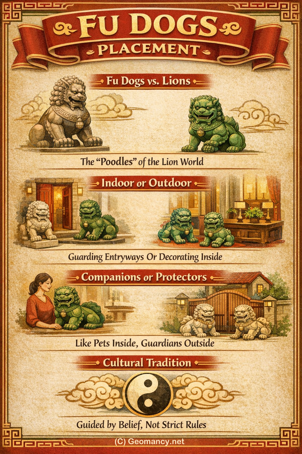 Here are a few interesting insights drawn from the discussion on the correct way of placing Fu Dogs: 🦁 Fu Dogs vs. Lions: Fu Dogs are considered the smaller, more symbolic cousins of the grand lion statues often seen guarding entrances. They’re sometimes described as the “poodles” compared to the majestic lions, emphasizing their more decorative and approachable role. 🏠 Placement Flexibility: While tradition suggests placing them outside the main door on either side, it’s also acceptable to keep them indoors—such as in hotel lobbies—since they are not religious objects but rather symbolic statues. 🐕 Companion Symbolism: The role of Fu Dogs is likened to real pet dogs—some are kept inside as companions, while others guard the home from outside. This dual symbolism reflects symbolisms or beliefs and not Feng Shui. 🎭 Cultural Belief, Not Doctrine: Their placement is guided more by cultural belief than strict rules. This flexibility allows for adaptation in modern contexts, such as hotels or homes, without violating Feng Shui principles.