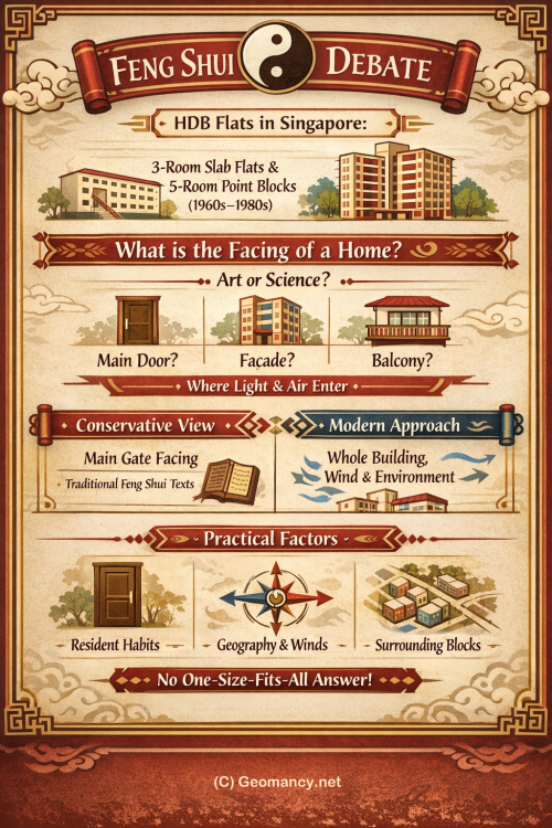 Here are the main points from this page: HDB Flat Types & History: Singapore’s Housing and Development Board (HDB) flats include 3-room “slab” flats and 5-room “point blocks,” mostly built between the 1960s–1980s. Facing Direction Debate: Determining the facing of a flat is considered more an art than a science. Geomancers disagree: some use the main door, others the block’s façade, or even the balcony. The “mouth” of the home is where light and air enter, often guiding the choice. Conservatives vs Modernists: Conservatives insist on traditional methods (main gate as facing, based on old Feng Shui texts). Modernists adapt to apartment living, sometimes considering the entire building’s façade or environmental factors like wind flow. Practical Considerations: Residents’ habits matter: if the main door is usually shut, it may not be the true “mouth” of the home. Geography and wind direction (e.g., monsoon winds in Marine Parade) influence qi flow. Site plans and surrounding blocks also affect interpretation. Case Studies & Examples: Examples include Hillbrooks development, where multiple entrances complicate facing determination. Master Lee emphasizes “location, location, location” — external environment, site, block, and unit account for about 70% of Feng Shui luck. Key takeaway: There is no single “correct” method. Facing direction depends on interpretation, habits, and environmental context, with geomancers split between conservative textbook approaches and modern adaptive methods.