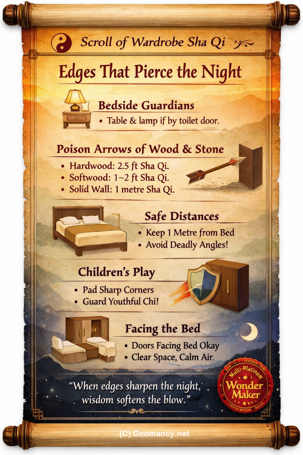 🌙 Key Feng Shui Insights Bedside tables: Generally not mandatory unless the bed is directly beside a toilet door. In that case, a bedside table with a lamp can act as a symbolic partition. Wardrobe edges: The sharp corner of a wardrobe or cabinet at a 45° angle can create sha qi (poison arrows). Hardwood corners: poison arrow extends ~2.5 feet. Softwood corners: ~1–2 feet. Solid wall corners: ~1 metre. Placement caution: Avoid placing wardrobes or cabinets too close to the bed, as their edges may direct harmful energy toward sleepers. Child safety: If children play on the bed, protect sharp wardrobe corners with child-proof materials to prevent accidents. Wardrobe facing bed: No major Feng Shui issue if the wardrobe doors face the bed, as long as clearance space is maintained. Air-conditioning should not blow directly onto the bedhead. General advice: Acute angles or columns should ideally be at least one metre away from the bed to minimize negative energy. 🪔 Practical TakeawayThe concern isn’t the wardrobe’s presence itself, but whether its sharp edges point toward the bed. Mitigation strategies include bedside tables (when near toilets), protective coverings for corners, and ensuring enough clearance space.