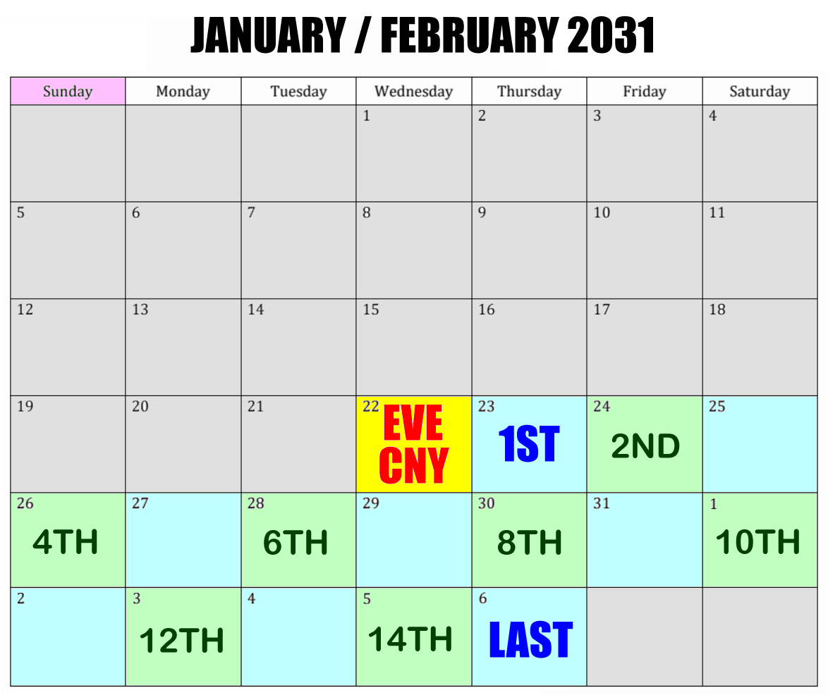Year of the Metal Pig Reunion Dinner on Friday 22nd January Chinese New Year’s Eve reunion dinner (年夜饭 / 團年飯) is one of the most important traditions in Chinese culture. Its importance comes from several layers of meaning: 1. Family unity and togetherness - It’s the most important family gathering of the year—similar in significance to Thanksgiving dinner in the US or Christmas dinner in many Western countries. - People travel long distances (the Spring Festival travel rush 春运) just to be home for this meal. Being present at the table shows belonging and commitment to the family. 2. Honoring ancestors and family roots - Many families offer incense, food, or prayers to ancestors before the meal. - This shows respect to previous generations and reinforces the idea that the family is a continuous line, not just the people currently alive. 3. Wishes for prosperity, health, and good fortune - The dishes are symbolic, chosen for their meanings: - Fish (鱼 yú) – sounds like surplus (余): wishing for abundance. - Dumplings (饺子) – resemble ancient ingots: symbolizing wealth. - Nian gao (年糕) – sounds like year higher: wishing for progress and promotion. - Longevity noodles – wishing for long life. - Eating these foods together is like a shared, ritual way of sending blessings into the new year. 4. Reinforcing family roles and bonds - Elders sit in honored seats and often give red envelopes (红包) with money to children and younger relatives. - This passes down not just money, but also blessings and expectations, showing care and responsibility across generations. 5. Closure of the old year and welcoming the new - The meal marks the transition point between the old year’s difficulties and the new year’s hopes. - People often avoid arguments and negative talk at the table, believing it may affect the luck of the coming year. 6. Cultural continuity and identity - For Chinese people in China and the diaspora, the reunion dinner is a strong link to cultural heritage. - Even if other traditions fade, families often still keep this one, because it’s simple, emotional, and deeply meaningful. 7. Emotional comfort and belonging - Beyond symbolism, it’s a moment of warmth: familiar dishes, family jokes, shared memories. - For many, it’s the one time a year when everyone slows down and truly reconnects. +++ CHINESE NEW YEAR 2031 23RD JANUARY 2031 TO 6TH FEBRUARY 2031 When to open for business or start work? On any of these days:- Friday, 24th January (2th Lunar day) Sunday, 26th January (4th Lunar day)** Tuesday, 28th February (6th Lunar day) Thursday, 30th February (8th Lunar day) **Note: Although Sunday 26th is one of the days, it typically falls on a Sunday, which is a rest day for most people. +++ Geomancy.net will close on February 22th at 12 PM GMT+0800 and will resume operations on February 24th, 2031. +++ North 6 1 8 7 5 3 2 9 4 South Take note the following sectors: Misfortune & Sickness Star this year is at Centre +++ with Sickness Star this year is at South West +++ Disputes/Quarrel Star this year is at East +++ Other Sectors: Education/Romance Star this year is at South-East Grand Duke this year is North-North-West, 330 Degree. - Avoid sitting facing the grand duke or disturbing him by having renovations. Location in Conflict is West. - Avoid having renovations done opposite the location in conflict. +++ Do you understand why we choose to do business during Chinese New Year only on even lunar days? We start work on the 2nd, 4th, 6th, 8th, 10th, or 12th days of the lunar new year. In our culture, even numbers stand for “double happiness” and represent balance, while odd numbers are seen as unbalanced. Traditional funeral customs also support this belief. Funerals are usually held on odd days. For example, if someone passes away on a Monday, the funeral would be held on the next Wednesday, Friday, or Sunday, following the pattern of odd days. This follows the idea of Yin and Yang, where odd days are Yang, and the deceased represent Yin, so they should be buried on a Yang day to maintain harmony. How strictly is this tradition followed in modern Chinese business practices? How closely businesses follow the tradition of working on even lunar days during Chinese New Year depends on the company. Traditional and family-run businesses, especially in places where customs are still strong, usually follow this rule quite strictly. Important activities like reopening after the holiday or signing contracts are often set on lucky days. Feng Shui and the meanings of numbers still matter a lot in these choices. Larger companies and international firms are usually more flexible. Some may recognize the tradition in a symbolic way but do not let it control their whole schedule, especially when they work with global clients or partners. For these businesses, practical needs sometimes come first. Even so, most companies know about and respect these lucky dates and customs. Many still talk to Feng Shui experts or think about cultural beliefs when choosing important business dates. Today, there is a mix of old traditions and modern needs, with companies keeping the customs when they can without slowing their work. In summary, how strongly this tradition is followed depends on the type of business and its environment, but these cultural beliefs still influence Chinese business practices in many ways. +++ Overview of the traditional meaning and customs for each of the 15 days of the Chinese Lunar New Year (Spring Festival). Customs vary by region, but these are widely recognized themes: Day 1 – 正月初一: Welcoming the Deities / New Year’s Day - Significance: Official start of the New Year; welcoming gods of Heaven and Earth. - Customs: - Wear new clothes, preferably red or bright colors. - Offerings to household gods and ancestors. - Visits from married children to parents (in many regions, this is done Day 2 instead). - Avoid sweeping or taking out garbage 