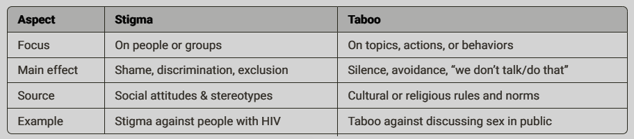 Stigmas and Taboos 1. What is stigma? Stigma is a negative label or mark placed on a person or group because of a particular characteristic, condition, or behavior. It leads to shame, discrimination, and social rejection. - It’s about how people are judged and treated. - Often tied to: - Mental illness - HIV/AIDS - Addiction - Disability - Sexual orientation - Example: Someone with depression might be seen as “weak” or “unstable,” causing others to avoid them or treat them unfairly. Key idea: Stigma targets people. --- 2. What are taboos? A taboo is a social or cultural rule that says certain topics, actions, or behaviors are forbidden, shameful, or not to be discussed. - It’s about what is allowed or not allowed in a culture. - Often tied to: - Sex and sexuality - Death and dying - Menstruation - Certain foods or religious practices - Example: In some cultures, talking openly about sex is taboo, even within families. Key idea Taboos target topics or behaviors. --- 3. How they relate - Taboos can create stigma. If something is taboo (e.g., talking about mental health), people who experience it (e.g., those with mental illness) can become stigmatized. - Stigma reinforces taboos. When people are shamed or punished for breaking a taboo, it keeps the silence and fear around that topic.