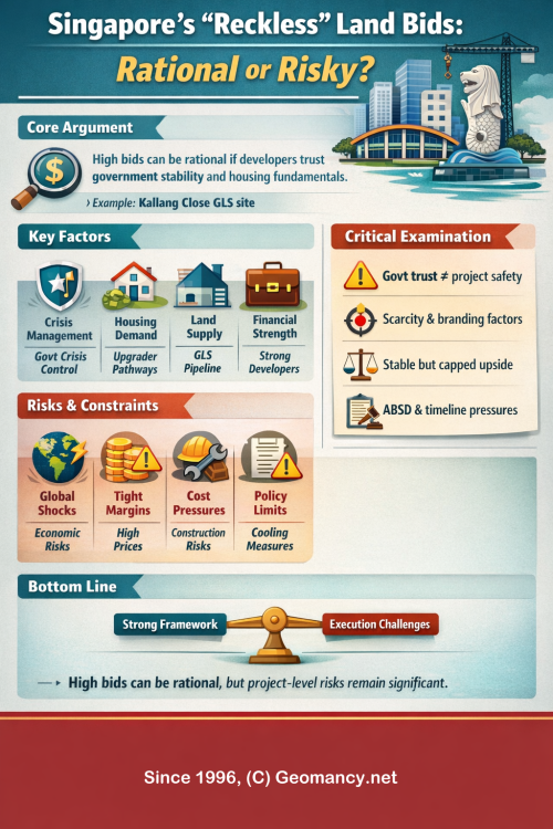 Here are the distilled main points from this page: Core ArgumentDevelopers’ seemingly “reckless” bids for housing land in Singapore can be rational if they trust the government’s ability to manage crises and sustain housing fundamentals. Example: Kallang Close GLS site, where Frasers Property + Mitsubishi Estate submitted a notably high bid. Supporting FactorsSingapore’s strong crisis-management track record. Government control over housing supply via GLS pipeline. Deep structural demand from high homeownership and HDB-to-private upgrader pathways. Financial strength and diversification of winning bidders. Risks & ConstraintsGlobal shocks (energy prices, interest rates, external demand). Tight project economics requiring very high selling prices. Execution risks: rising construction costs, contractor shortages, timeline pressures. Policy cooling measures that cap upside potential. Critical ExaminationFaith in government reduces systemic risk but doesn’t eliminate project-level risk. High bids may reflect scarcity, branding, or portfolio positioning, not just optimism. Policy support stabilizes but also constrains upside. Execution challenges (resources stretched, ABSD timelines) can dominate outcomes. Pros vs ConsPros: Prime location, resilient demand, government credibility, controlled land supply, strong sponsors. Cons: Geopolitical shocks, higher interest rates, cost escalation, thin margins, timeline penalties. Bottom LineAggressive bids aren’t irrational if developers believe Singapore’s stabilizing framework will prevent systemic collapse and if they have the balance sheet to absorb volatility. However, project-level risks remain significant, and the same stabilizing policies that reduce downside may also limit the upside needed to justify record land prices.