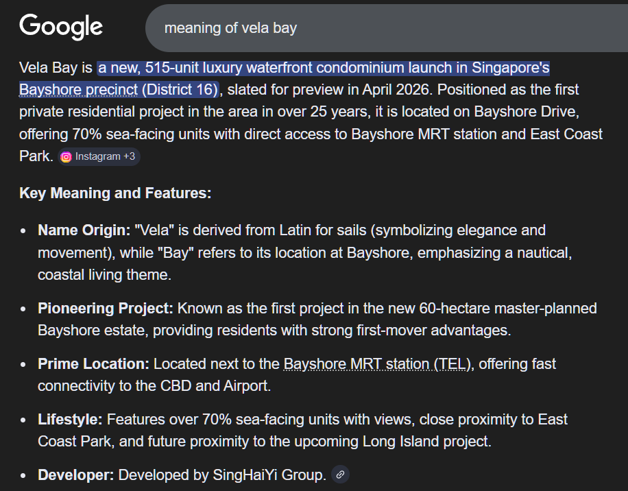 What's in a name like Vela Bay? Name Origin: "Vela" is derived from Latin for sails (symbolizing elegance and movement), while "Bay" refers to its location at Bayshore, emphasizing a nautical, coastal living theme.