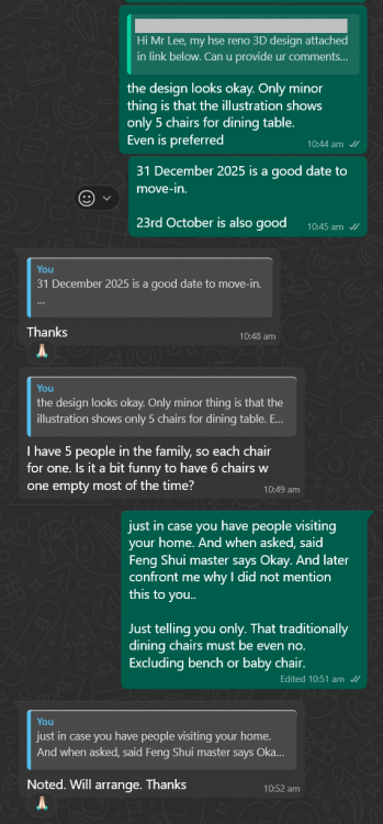 Master Cecil Lee: The design looks okay. Only minor thing is that the illustration shows only 5 chairs for dining table. Even is preferred Client: I have 5 people in the family, so each chair for one. Is it a bit funny to have 6 chairs w one empty most of the time? Master Cecil Lee: Just in case you have people visiting your home. And when asked, said Feng Shui master says Okay. And later confront me why I did not mention this to you.. Just telling you only. That traditionally dining chairs must be even no. Excluding bench or baby chair. -