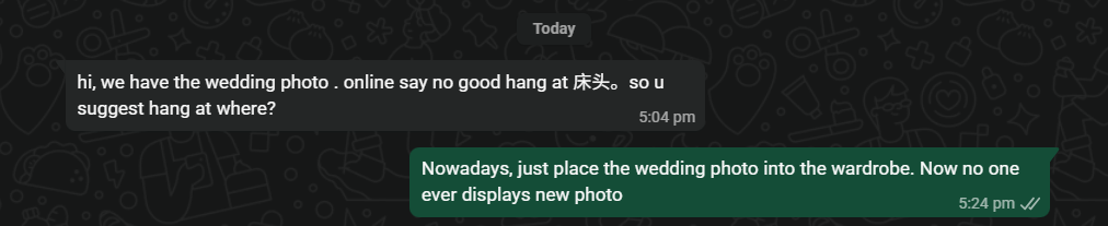 help translate hi, we have the wedding photo . online say no good hang at 床头。so u suggest hang at where? Means: Hi, we have a wedding photo. People online say it’s not good to hang it above the bed (床头). Where would you suggest we hang it? Nowadays, just place the wedding photo into the wardrobe. Now no one ever displays new photo