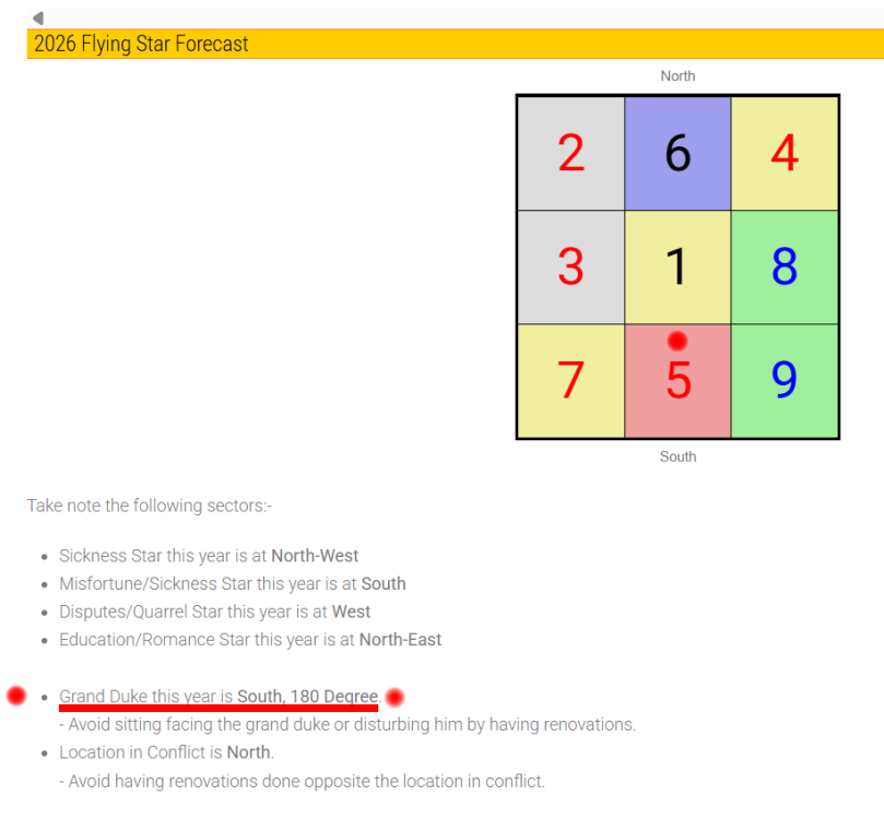 Check annual Tai Sui location for the next few years:- https://www.geomancy.net/content/feng-shui-resources/yearly-forecast/chinese-horoscope-feng-shui-yearly-forecast +++ For example: Year 2026, where is Grand Duke located? https://www.geomancy.net/content/feng-shui-resources/yearly-forecast/horse-2026-chinese-horoscope-feng-shui-yearly-forecast In Year 2026, Grand Duke (Tai Sui) is located at South 180 degrees direction:
