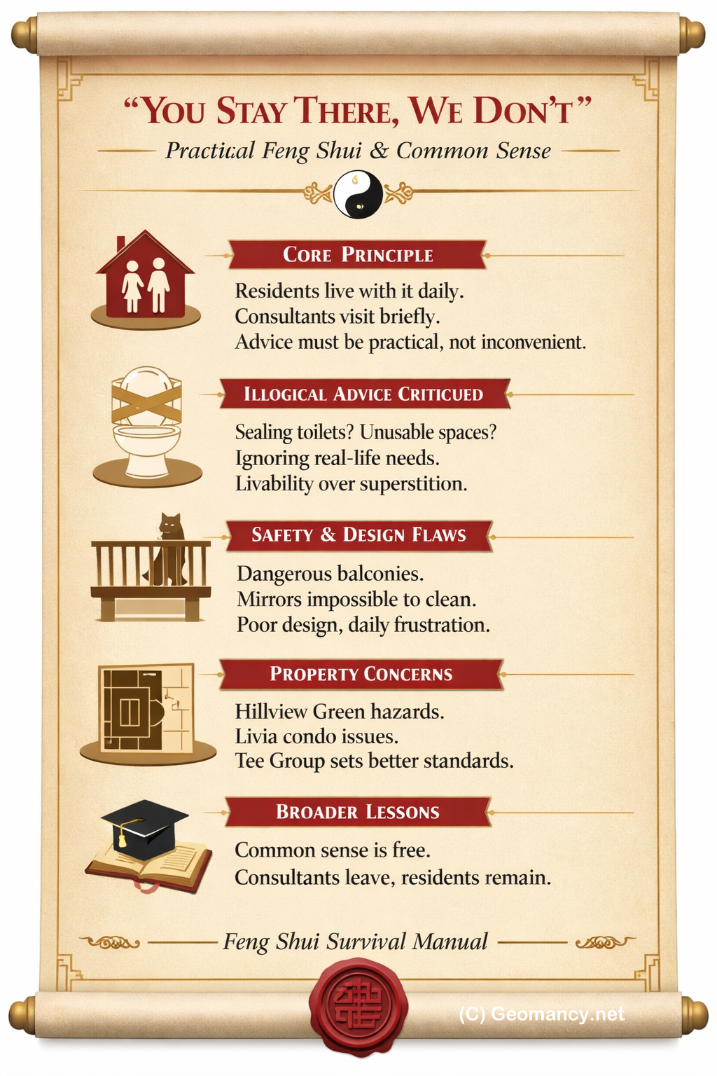 Core GuidelineThe central principle emphasized is: “You stay there, we (outsiders) don’t.” This means Feng Shui advice must be practical and livable for the residents, not just convenient for consultants. Critique of Illogical AdviceSome geomancers give impractical recommendations (e.g., sealing up or avoiding use of the master toilet). Such advice ignores the reality that residents must live with the consequences daily, while consultants only visit briefly. Common Sense in DesignSafety concerns are highlighted, such as dangerous balcony gaps in condominiums that could be fatal for children or pets. The author criticizes architects and developers for poor design choices that lack common sense. Property Development ConcernsSpecific criticism of City Developments Ltd projects: Hillview Green: balcony barriers seen as unsafe. Livia condo: interior walls made of plasterboard instead of solid concrete, raising durability and moisture concerns. Comparison with Tee Group, which provides clearer material specifications in brochures. Case Studies & ExamplesExample of impractical interior design: mirrors installed behind thick motif panels that are impossible to clean. Reinforcement of the principle: service providers must consider long-term consequences for clients. Broader LessonsA “degree in common sense” is free, yet often ignored in professional advice. The author refuses to recommend contractors/IDs due to inconsistency in service quality and accountability. The recurring moral: clients live with the outcomes, so advice must prioritize their daily reality.