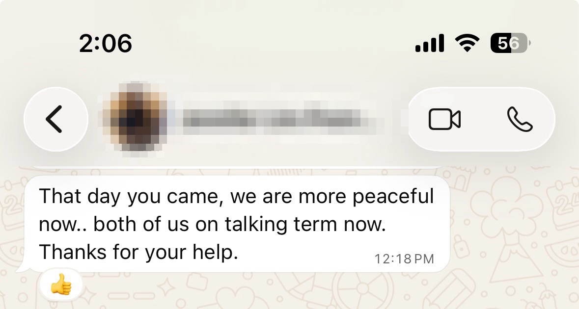 That day you came, we are more peaceful now.. both of us on talking term now. Thanks for your help.