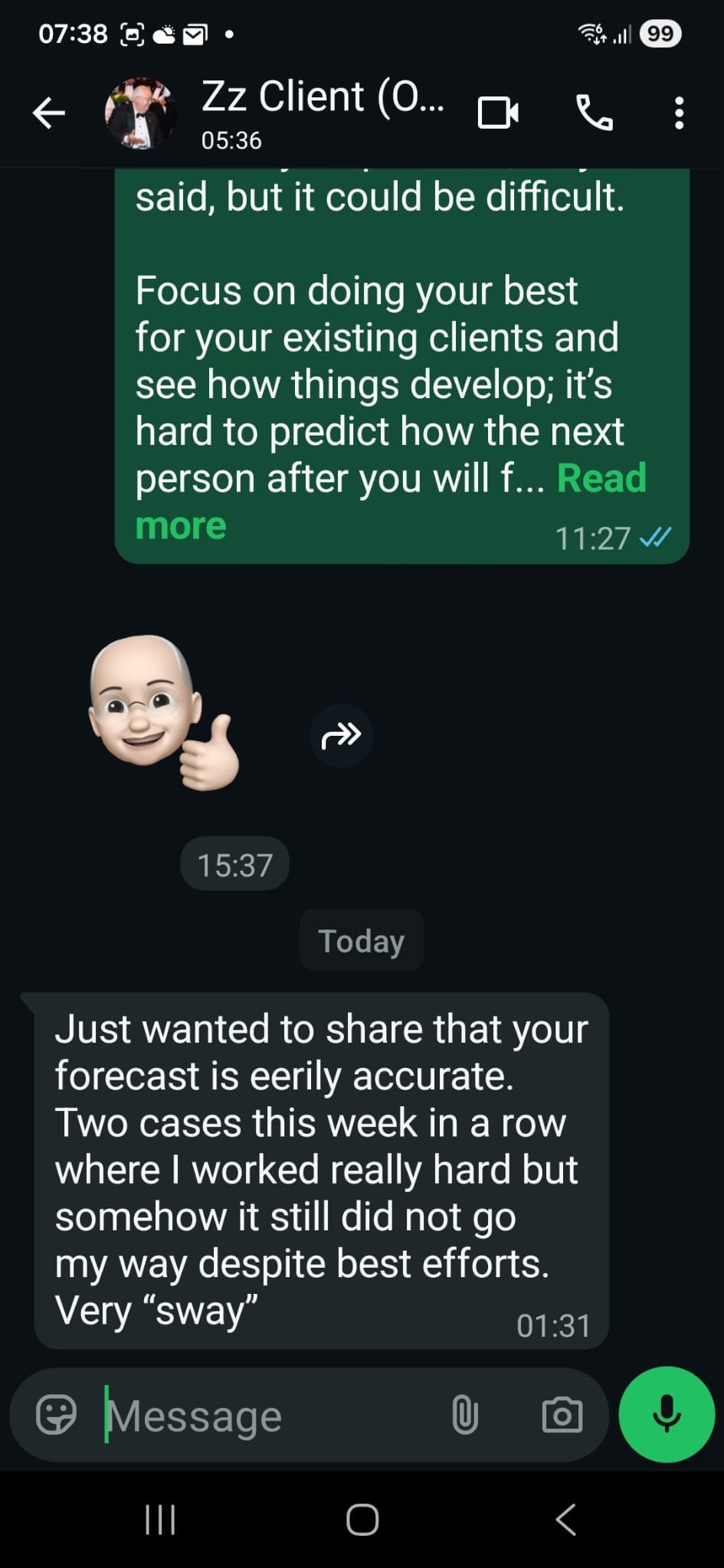 Just wanted to share that your forecast is eerily accurate. Two cases this week in a row where I worked really hard but somehow it still did not go my way despite best efforts.