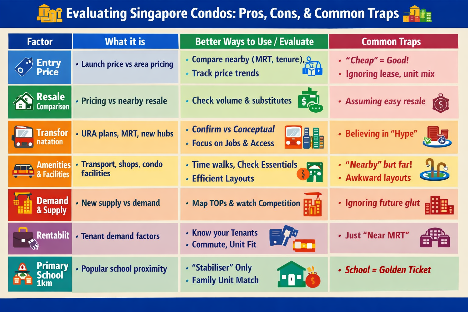 Another Practical Framework to Evaluate Singapore Condos: Pros, Cons, and What People Often Miss Singapore property discussions often revolve around a familiar checklist: Entry Price, Resale Comparison, Transformation, Amenities & Facilities, Demand & Supply, Rentability, and Primary School proximity. These are useful—but each has blind spots. Below is a grounded way to analyse each factor, with pros/cons, what to look for, and common traps. --- 1) Entry Price (Is it “cheap” for the area—or just “cheap for a reason”?) What it is: Comparing a project’s launch price (usually in $PSF) against its surrounding region’s pricing range at that point in time. Some also try to infer the developer’s break-even vs profit margin. Pros - Forces context: A $2,300 psf condo means different things in CCR vs OCR. - Highlights mispricing: Occasionally, new launches are priced close to older resale condos nearby, creating a “value gap” opportunity. - Useful for downside risk: Buying at the top of a micro-market can limit exit options. Cons / Pitfalls - “Region pricing range” can be misleading: Singapore has micro-markets. A project 700m from an MRT can price very differently from one 1.5km away, even if both are “District X”. - New launch vs resale isn’t apples-to-apples: New launches bake in brand-new lease, nicer facilities, developer warranties, and marketing premiums. - Developer break-even is hard to estimate reliably: Land cost is known, but construction cost assumptions, financing, marketing, and product mix vary widely. Over-focusing on “developer margin” can create false confidence. Better ways to use Entry Price - Compare within a tight radius and similar attributes: - distance to MRT (walk vs feeder bus) - tenure (99 vs freehold) - unit mix (mostly 1–2BR vs family-heavy) - remaining lease (for resale condos) - Track price positioning over time, not just a single snapshot: - Was it launched at a premium to nearby resale, and did that premium widen? --- 2) Resale Comparison (How liquid is your exit—really?) What it is: Comparing your target project’s pricing to comparable resale transactions nearby. Pros - Reality check on exit price: Resale data reflects what buyers actually paid (not what was asked). - Helps spot “ceiling prices”: Some neighbourhoods have psychological caps unless a big catalyst arrives (new MRT, major jobs node, etc.). - Signals buyer depth: Frequent transactions often indicate better liquidity. Cons / Pitfalls - Comparables can be wrong: Similar PSF doesn’t mean similar desirability (layout efficiency, facing, noise, condo prestige, proximity to amenities). - Newer condos typically trade at a premium: If you compare a 2026 TOP to a 2005 TOP directly, you may underestimate fair premium (or overestimate “upside”). - Small sample sizes: In boutique projects, a few transactions can distort the perceived market. Better ways to use Resale Comparison - Look at: - transaction volume (liquidity) - price dispersion (wide swings may indicate a “story-driven” project) - gap vs nearby substitutes (what else can a buyer buy with similar budget?) --- 3) Transformation (The “URA Master Plan” story: opportunity + timing risk) What it is: Government plans (URA Master Plan, new MRT lines, redevelopment, new commercial nodes, rejuvenation projects) that could improve accessibility, jobs, and lifestyle. Pros - Can create real demand: New MRT stations, business parks, and lifestyle nodes can change renter/buyer behaviour. - Supports longer-term appreciation: If transformation adds jobs and improves connectivity, demand can become structural, not just speculative. Cons / Pitfalls - Time horizon mismatch: Transformation can take 5–15 years. Your holding power matters. - “Priced-in” risk: By the time it’s widely known, developers may already price in the upside. - Execution uncertainty: Plans can be phased, resized, or delayed. Even when delivered, impact may be uneven across the area. Better ways to analyse Transformation - Separate catalysts into: - Confirmed & funded (e.g., station under construction) - Planned conceptually (early-stage land use intents) - Ask: Does transformation add (1) accessibility, (2) jobs, (3) amenities, or only “nice-to-have” beautification? The first two tend to move prices/rents more decisively. --- 4) Amenities & Facilities (Convenience sells—but so do low monthly outgoings) What it is: Nearby transport, food, groceries, and internal condo facilities (pool, gym, function room, etc.). Also includes unit size and liveability. Pros - Direct impact on rentability and resale: Convenience is one of the most consistent drivers of tenant and buyer choice. - Reduces vacancy risk: A tenant who can walk to MRT/supermarket is less price-sensitive. - Liveability matters for owner-occupiers: Practical layouts and daily convenience often beat “fancy brochure features”. Cons / Pitfalls - Facilities aren’t free: More facilities often mean higher maintenance fees, which can reduce investor yield or buyer appetite later. - “Condo facilities checklist” is not universal: Tennis courts, huge grounds, multiple pools—some buyers love them, others see them as cost-heavy. - Unit size and efficiency can trump facility count: A 2BR with awkward corridors may underperform a smaller but efficient layout. Better ways to evaluate Amenities & Facilities - Measure walk time, not “nearby”: - actual sheltered walkway? - crossings/traffic lights? - slope/heat exposure? - Look for “daily essentials”: - supermarket, hawker/coffee shop, clinic, childcare, bus interchange/MRT - Check layout efficiency: - bay windows, long corridors, odd angles = wasted area = weaker value retention --- 5) Demand & Supply (The macro story is important—but the pipeline is everything) What it is: Balancing how many units are coming into the market (new supply, upcoming TOPs, GLS sites) against demand drivers (household formation, upgrade