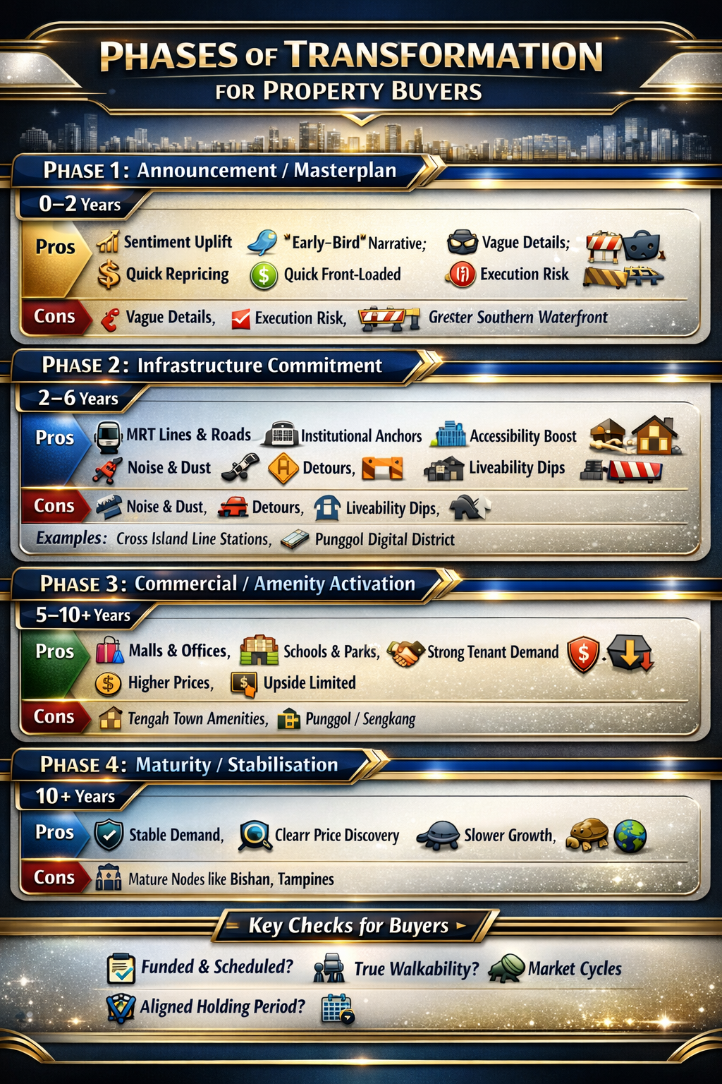 +++ The 3 Certainties of Property Transformation: A Professional Framework for Timing Your Entry The 3 Signals: When to Enter Real estate outperformance is rarely about “finding a cheap unit.” It is more often about entering a location at the right point in its transformation cycle—when the market has not yet fully priced in what is coming, but the probability of change is rising. A practical way to time this is to track three escalating forms of certainty: 1. Planning Certainty (Early Entry) 2. Physical Certainty (Growth Entry — the Sweet Spot) 3. Lifestyle Certainty (Final Entry) Each stage carries a different risk profile, valuation logic, and profit potential. The investors who consistently do well are not guessing the future—they are buying certainty before it becomes consensus. Since 1996, (C) Geomancy.net Stage 1 — Planning Certainty (Early Entry): “The Blueprint Is Real, But the Ground Is Empty” What it looks like - Government master plan announced - Zoning confirmed, land use intentions clarified - Nothing built yet (or minimal enabling works) - The narrative is strong, but proof on the ground is limited Why prices are lowest here At this stage, the market discounts heavily because the timeline is long and outcomes feel abstract. Even if the plan is credible, buyers price in: - execution risk (delays, phasing, policy shifts) - opportunity cost (capital tied up for years) - uncertainty around the eventual “vibe” of the area Result: This stage often offers the lowest entry prices in the entire cycle. Who Stage 1 is for - Investors with long holding power - Buyers comfortable with “paper certainty” and longer waits - Portfolios that can tolerate slower initial appreciation Example: Paya Lebar Airbase (PLA) - Announced in 2013, reinforced by planning clarity including the 2025 Master Plan - Approximately 800 hectares of future mixed-use development - Connectivity uplift (e.g., Cross Island Line integration) - Major development expected to ramp in the 2030s Interpretation: This is classic Planning Certainty—arguably the lowest-cost point of entry, but also the longest runway. Stage 2 — Physical Certainty (Growth Entry): “You Can See It Now” (The Sweet Spot) One of the most often-quoted examples in the recent past was Bidahari Estate. What it looks like - MRT stations opening or operational - BTO projects completing, population starting to form - Cranes are up (active construction, visible delivery) - Roads, bridges, parks, and commercial nodes are clearly taking shape This is the inflection point where the market shifts from believing to recognizing. Why this stage tends to produce the biggest profits Stage 2 is where you often get the best mix of: - de-risking (proof replaces speculation) - still-wide valuation gap (future amenities are not fully priced) - accelerating demand (buyers upgrade their confidence) In simple terms: the discount for uncertainty shrinks rapidly, but the neighbourhood is not “finished”—so you are not yet paying the full lifestyle premium. Who Stage 2 is for - Buyers seeking strong upside with reduced uncertainty - Investors who want to ride the re-rating phase (not just wait for completion) - Owners comfortable with some construction disruption in exchange for value capture Example: Bidadari (The “Cemetery” Mispricing) When The Woodleigh Residences launched in 2019 at about $1,733 psf, public perception lagged reality. Many still anchored on the old “cemetery” identity. But the physical signals were already strong: - MRT presence and connectivity were real - Roads were being realigned and infrastructure works were tangible - BTO completions were bringing in residents and demand fundamentals A reported outcome: ~$660,000 profit—generated not by buying a finished estate, but by buying during Physical Certainty, before broad-market pricing fully adjusted to the new reality. Example: Lentor (Certainty Compression in Real Time) With the Thomson–East Coast Line (TEL) and the area’s redevelopment momentum, Lentor illustrates how pricing can escalate as certainty increases: - Early launches price in “potential” - Later launches price in “proof” (transport reliability, buyer adoption, comparable transactions) - Each new delivery milestone compresses the uncertainty discount further Key takeaway: In districts like Lentor, the biggest jumps typically come as the MRT and surrounding projects transition from plan → operation → lived experience. Stage 3 — Lifestyle Certainty (Final Entry): “Complete, Convenient, Premium” What it looks like - Area is fully developed - Amenities are complete (retail, schools, parks, transport integration) - A vibrant community exists (the place has identity and habit) - Rental demand is stable, and owner-occupier willingness to pay is high Why profits are solid but moderate By Stage 3, you are paying for: - certainty - convenience - comfort - a proven neighbourhood The trade-off is that the explosive repricing has usually already happened. Returns can still be good, but the entry price is higher, and incremental gains are often steadier rather than outsized. Who Stage 3 is for - Owner-occupiers prioritizing quality of life and predictability - Investors seeking stability, easier leasing, lower “execution risk” - Buyers who prefer to pay a premium to avoid transformation disruption Example: East Coast (Finished-Neighbourhood Premium) Examples cited: - Liv @ MB buyers averaged about $275K–$354K profit - Amber Park averaged about $264K–$536K These are respectable outcomes—but the entry pricing tells the story: - Buyers entered around $2,368–$2,479 psf, substantially higher than Woodleigh’s earlier $1,733 psf Interpretation: East Coast reflects Lifestyle Certainty—strong, proven demand and good profits, but much of the “transformation alpha” is already captured in the price you pay. --- The Core Insight: Markets Don’t Reprice Once—They Reprice Three Ti