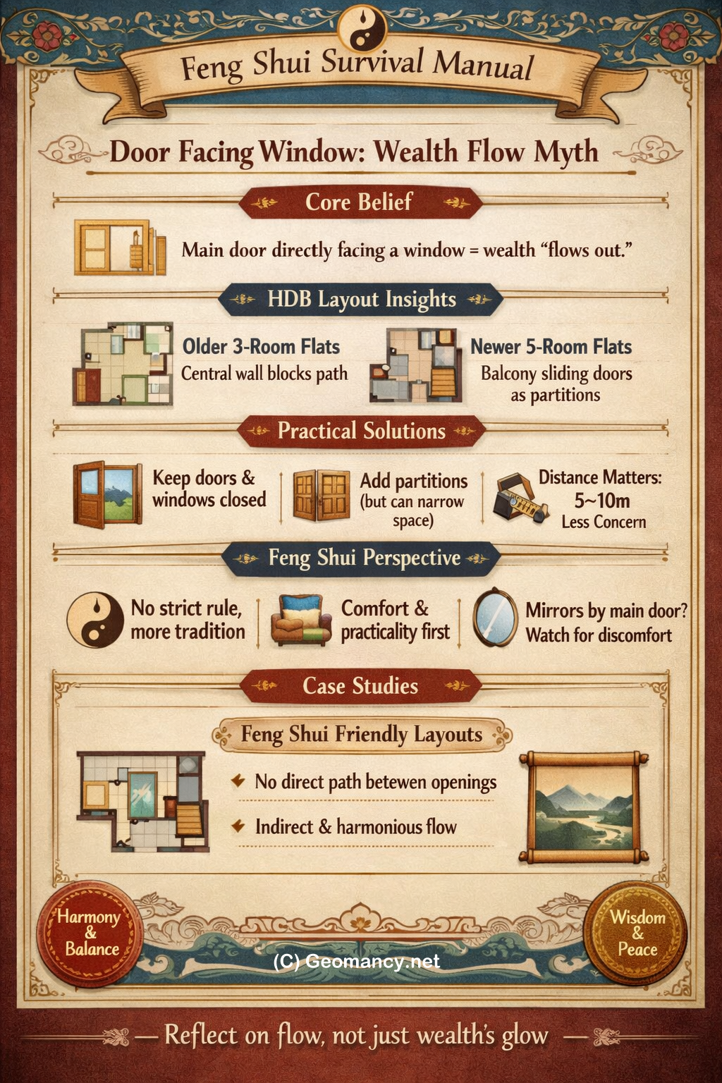 Here are the main points from this page: Common belief: Many people think that if the main door directly faces a window, wealth may “flow out.” This idea is widespread even among those who don’t formally practice Feng Shui. Practical solutions: To avoid a direct path between door and window, people often install partitions, keep balcony sliding doors, or simply close windows. HDB layouts: Older 3-room flats often have a wall in the middle, preventing a straight path from door to back windows. Newer 5-room flats usually retain balcony sliding doors, which act as partitions. Removing them can create a direct line between door and window, so closing casement windows is advised. Distance matters: If the window is far (e.g., 5–10 meters away), it’s generally less of a concern. No strict rules: There isn’t a hard-and-fast Feng Shui law here. Comfort and practicality matter—consult family or friends to see if the layout feels right. Partitions: Adding a partition can help, but it may make passageways narrow. The usefulness depends on the specific layout. Other considerations: Mirrors near the main door can cause discomfort if they reflect someone suddenly upon entry. Case studies: Examples of “Feng Shui friendly” designs show layouts where there’s no direct path between openings, which is considered favorable. In short, the concern about wealth flowing out is more a traditional belief than a rigid Feng Shui rule. The key is avoiding a direct line between the main door and window, often solved with partitions, sliding doors, or simply keeping windows closed.