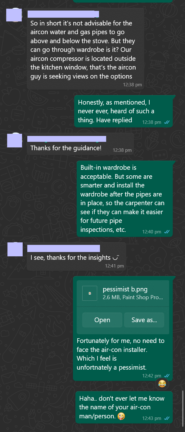 Hi Cecil, 1) can aircon pipe gas and water go above stove and wardrobe? 2) Can aircon pipe gas and water go below stove level? 1. Frankly, this is the first time in my life I’ve seen something like this. For a moment, I thought it was the twilight zone for it to be above the stove. As long as it’s not induction and there’s electricity, it’s possible. A wardrobe is common. 2. I need to take Panadol Extra. This is the first time I’ve heard of this. If there’s no choice, even if I have to “break an arm” — touch wood — if it has to be done, it has to be done. So in short it’s not advisable for the aircon water and gas pipes to go above and below the stove. But they can go through wardrobe is it? Our aircon compressor is located outside the kitchen window, that’s the aircon guy is seeking views on the options Built-in wardrobe is acceptable. But some are smarter and install the wardrobe after the pipes are in place, so the carpenter can see if they can make it easier for future pipe inspections, etc. Fortunately for me, no need to face the air-con installer. Which I feel is unfortunately a pessimist. Haha.. don't ever let me know the name of your air-con man/person.