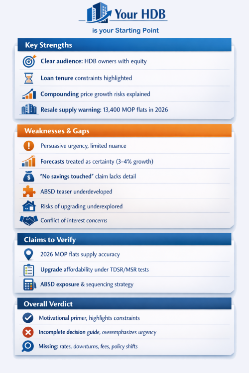 Is your HDB a starting point? What it is (and what it isn’t) The guide positions itself as an educational, “not a sales pitch” walkthrough for HDB owners considering upgrading to private property, with an emphasis on acting soon rather than waiting. In practice, it reads like advisory marketing: it frames upgrading as a near-default next step, uses urgency (“window… won’t stay open”), and repeatedly nudges readers to contact an advisor.--- For privacy, the actual guide is not included, here. What the guide does well (pros) 1. Clear target audience and narrative clarity It speaks directly to a specific segment—owners who bought early, paid down their loan, and built equity—making it easy for the intended reader to self-identify.2. Highlights real constraints that worsen with time The point that loan tenure (and therefore affordability) typically declines with age is directionally correct and is a real planning consideration for upgraders.3. Explains “waiting risk” in a simple, quantitative way The illustrative compounding example (3–4% growth turning a $1.8M condo into ~$1.87M in a year) is easy to grasp and helps readers understand that delay can increase the hurdle.4. Raises an important resale-supply consideration It flags a potential 2026 wave of MOP flats (13,400) as a selling-competition risk—useful as a hypothesis to verify against official data and market conditions.--- What’s weak / missing (cons) 1. Strong persuasion and urgency, but limited evidence and nuance Claims like “timing doesn’t improve by waiting” and “waiting is costing you” are asserted as near-universal truths, without showing scenarios where waiting is rational (e.g., income uncertainty, caregiving costs, interest-rate risk, or mismatched lifestyle needs).2. Forecasting is treated as a baseline rather than a risk The guide leans on “analyst forecast” appreciation of 3–4% as if it’s conservative and dependable, yet private home prices can be cyclical, policy-sensitive, and rate-sensitive—especially over a 1–3 year horizon.3. “Upgrade without touching savings” is a headline claim without the mechanics It promises upgrading “without touching their savings,” but the provided excerpts don’t explain the actual cashflow plan (bridging loan, timing of sale/purchase, CPF usage, cash downpayment, legal/agent fees, BSD/ABSD, renovation, and contingency buffers).4. ABSD is teased as a big trap, but not substantiated here The guide advertises “the ABSD mistake that costs… $300,000,” but the excerpt doesn’t show the conditions, math, or how common that outcome is—important because ABSD exposure depends on ownership sequencing, eligibility, and deadlines for selling the first property.5. One-sided framing of risk The “trap” section focuses on the risk of not upgrading (widening price gap, aging loan tenure, resale competition), but doesn’t balance it with the risks of upgrading (higher ongoing costs, condo fees, vacancy risk if renting out, renovation overruns, market drawdowns, and transaction costs).6. Potential conflict-of-interest is acknowledged but not resolved Saying “this is not a sales pitch” doesn’t remove incentive misalignment—especially when the call-to-action is to contact the advisor who shared it.--- Key claims to verify before acting - The 2026 “13,400 MOP flats” supply figure and how it compares to prior years, and whether it applies to your town/flat type (micro-markets can diverge).- Your actual upgrade affordability under TDSR (and MSR for HDB until sold), using current stress-tested rates and realistic expenses—not just a price-growth narrative.- ABSD exposure and timeline strategy (buy-first vs sell-first, remission rules if applicable, and bridging/temporary housing costs).--- Overall verdict As a motivational primer, it’s readable, concrete in a few places, and it correctly surfaces some genuine upgrade constraints (loan-tenure aging; compounding price gap; possible resale supply pressure).As a decision guide, it’s incomplete: it emphasizes urgency and upside while underexplaining the “no savings touched” mechanics, underweighting downside scenarios, and leaning on forecasts and teaser claims (ABSD) without showing the full assumptions. The guide heavily stresses the risk of waiting (price-gap widening, shrinking loan tenure with age, and 2026 resale competition) and focuses on avoiding ABSD via sequencing. What it does not adequately address are several major upgrade risks that can be financially material: - Interest-rate and financing risk: If mortgage rates rise (or stay high), your monthly instalments and stress-test affordability can deteriorate even if the purchase price is unchanged. The guide discusses tenure shortening with age but not rate sensitivity, refinancing risk, or payment shock.- Income/job and cashflow resilience: Upgrading increases fixed obligations; job loss, variable income, caregiving costs, or illness can turn an “affordable” plan into distress quickly. This downside scenario planning is absent.- Transaction and frictional costs beyond ABSD: Even if ABSD is avoided, buyers still face BSD, legal fees, valuation, agent fees, renovation/furnishing, moving, and contingencies—costs that can erase “upgrade gains.”- Ongoing holding costs of private property: Condo maintenance fees, sinking fund/special levies, higher insurance needs, and property tax changes can materially raise the monthly burn compared to an HDB.- Market and liquidity (downside) risk: Private prices do not move one-way; downturns, longer selling timelines, and wider bid–ask spreads can trap owners who need to exit. The guide emphasizes appreciation forecasts without balancing drawdown risk.- Sequencing execution risks the guide downplays: - Sell-first can expose you to temporary housing costs, rushed buying, or being unable to secure the desired condo after committing to sell.- Buy-together/refund path (marri