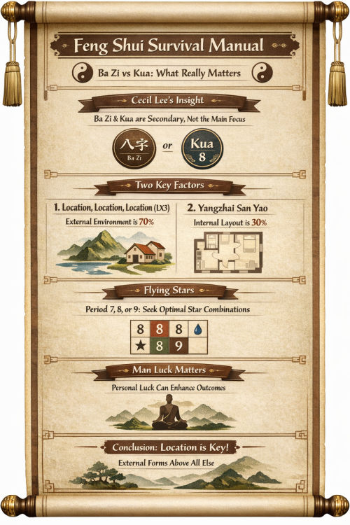 2. Here are the main points from this page: Key InsightsBa Zi vs. Kua (8 Mansion): The question is whether to prioritize Ba Zi (personal element chart) or Kua directions when choosing house orientation. Cecil Lee’s stance: Overly strict reliance on either system risks missing good opportunities. Ba Zi and Kua can be treated as supplementary, but they are not the central decision factors. Two decisive factors: Location, location, location (LX3): External environment, shapes, and forms carry the greatest weight (70%). Yangzhai San Yao: Internal layout principles account for the remaining 30%. Frontage factor: Plays only a minor role compared to LX3. Flying Stars consideration: Depending on the Feng Shui period (7, 8, or 9), certain star combinations at the frontage are preferred (e.g., double #8’s in Period 8, water star #9 in Period 9). Practical application over theory: Many rely too much on textbook knowledge; true mastery lies in applying Feng Shui practically. Human/Man Luck: Even if a house’s Feng Shui is average, personal luck can enhance outcomes. Conclusion: Prioritize location and external forms above all else. Ba Zi and Kua are useful but secondary.