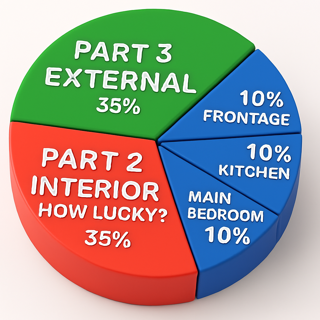 How a house is assessed for its suitability – whether you can or cannot buy it according to Feng Shui Part 1 of 3 = How suitable is the house - Frontage, Kitchen & Main Bedroom? [30 marks] Part 2 of 3 = How is the luck of the Internal Feng Shui of this house? [35 marks] Part 3 of 3 = External Feng Shui luck? [35 marks] + Overall score/grade [Total = 100 marks].
