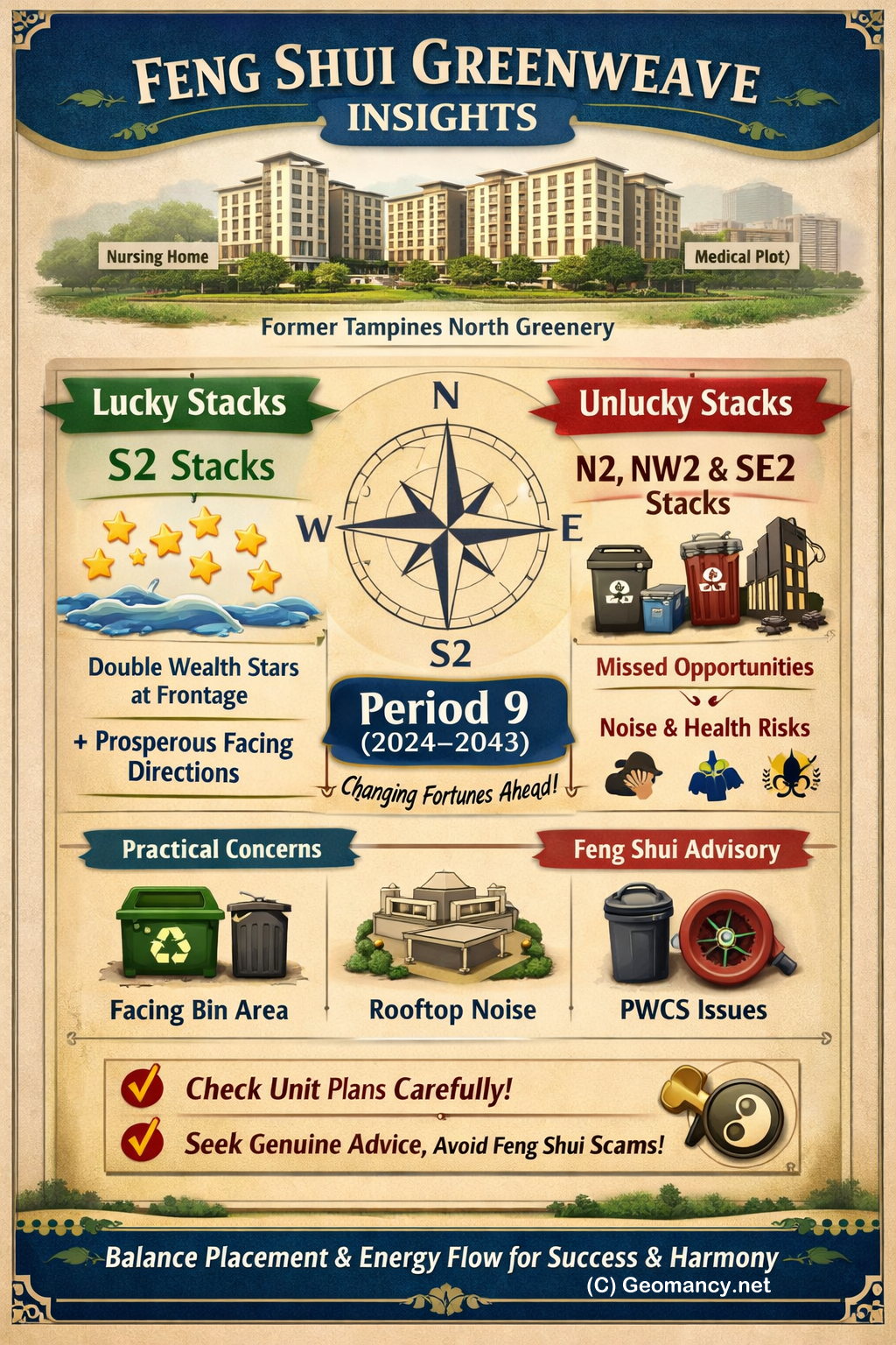 Here are the main points from this case study on HDB Tampines Greenweave: 🌳 Development & LocationBuilt on former Tampines North greenery, now cleared for housing projects like Greenweave and Greenridges. The site is rectangular, with nearby plots reserved for a nursing home and medical facility, which may hurt resale value for units facing them. Blocks 601A and 601B are exposed to noise from Tampines Ave 9. 🧭 Feng Shui Orientation (Flying Star Analysis)Most stacks face N2 or S2, with some facing NW2 or SE2. S2 stacks are most auspicious: double #8 wealth stars at the frontage, especially beneficial if water is present. However, kitchens at NW (Fire at Heaven’s Gate) can harm career luck. N2 stacks waste auspicious stars at the rear (kitchen/yard), making them less favorable. NW2 and SE2 stacks can benefit from water features at the balcony, but other sectors show imbalances and health risks. 🚮 Practical ConcernsSome units directly face the common bin lobby and recycling bins, which is undesirable and may affect resale value. Noise issues from nearby commercial rooftops (air-con cooling towers, extraction fans) can disturb residents. Problems noted with the Pneumatic Waste Conveyance System (PWCS) at Greenweave. 🔮 Period 9 Feng Shui (2024–2043)N2 stacks gain better luck under Period 9. S2, NW2, SE2 stacks lose former auspiciousness, with prosperity luck trapped or wasted in layouts. Overall luck assessment: 35% internal layout, 35% external Feng Shui (location, Sha Qi, poison arrows), 30% suitability to breadwinner. ⚠️ Advisory NotesBuyers should carefully study block plans to avoid units facing bins or medical plots. Authentic Feng Shui advice emphasizes energy flow and layout over commercial product sales; beware of scams and over-commercialization in the industry.