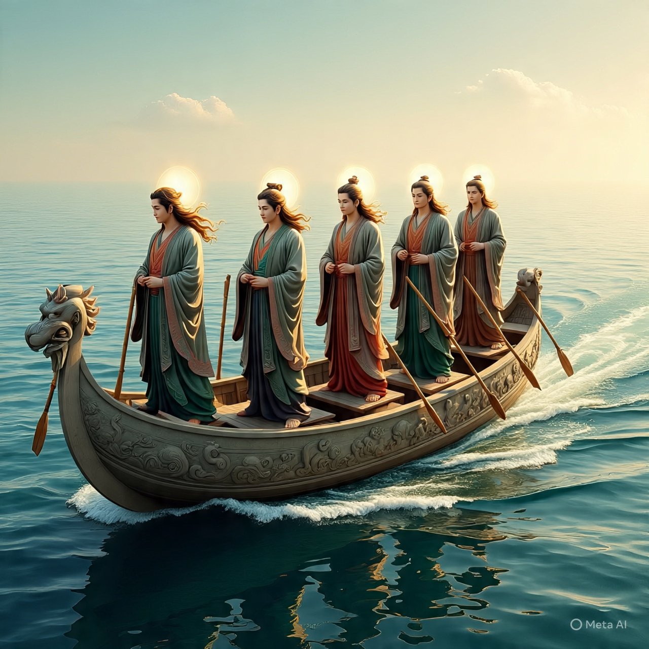 *** This is Pure Fantasy *** The Eight Immortals crossing the sea.. Oops! Three are missing on this boat.. maybe.. they are on the 2nd boat.. LOL Imagined by Meta AI - Mini fountain