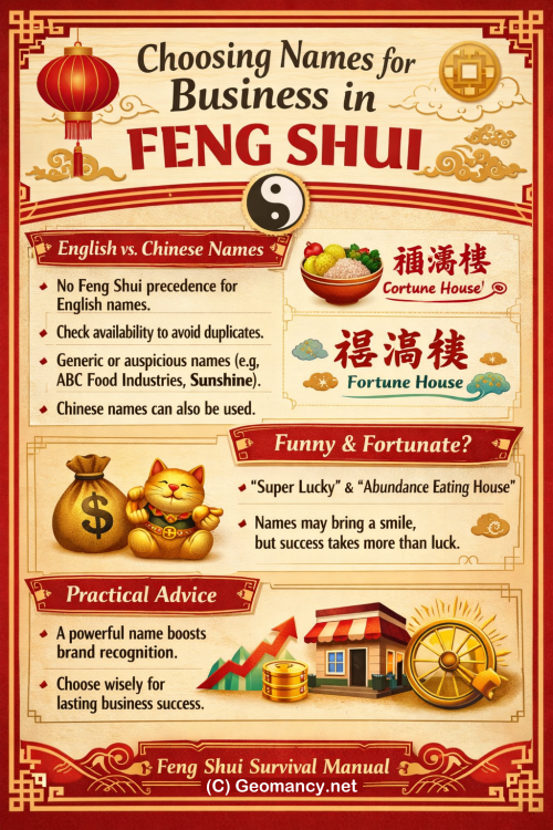 Here are the main points from this page on choosing names for business in Feng Shui: English vs. Chinese names: There is no Feng Shui precedence for English names. It’s important to check if the name is already taken by another company. Many businesses opt for generic names (e.g., ABC Food Industries) or auspicious ones (e.g., Sunshine). Choosing a Chinese name is still feasible, and businesses may also display it prominently on signage. Examples and commentary: Names like Super Lucky, Abundance Eating House, and Good Luck Chicken Rice were cited, sometimes humorously noting the irony of luck not extending to the actual business outcomes. The discussion highlights how names can project prosperity or fortune, but real-world success depends on more than just naming. Practical advice: A company’s name is a powerful tool for brand awareness. Whether it’s a first venture or a seasoned business, the right name can significantly influence recognition and success. In essence, the page blends Feng Shui considerations, cultural naming practices, and branding strategy, emphasizing that while auspicious names may help, careful thought and originality are equally important.