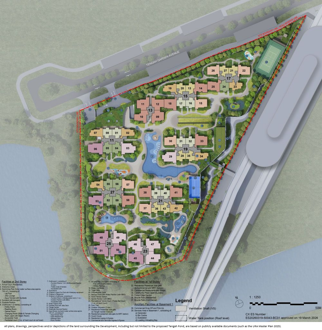 Project / launch - Project name: Tengah Garden Residences - Developer(s): Hong Leong Holdings, GuocoLand, CSC Land - **Preview start date:** Saturday, Apr 11 - **Notable positioning:** First private residential project with retail offerings launched in Tengah; also described as the first private project in the precinct Development specs - Total units: 863 - Unit types: 1- to 4-bedroom apartments - Building configuration: Nine 16-storey blocks/towers Pricing (starting) - Prices from S$1,779 psf - 1-bedroom: 484 sq ft, from S$980,000 (**S$2,025 psf**) - 2-bedroom: from 624 sq ft, from S$1.11 million (**S$1,779 psf**) - 3-bedroom: from 797 sq ft, from S$1.59 million (**S$1,993 psf**) - 4-bedroom: from 1,130 sq ft, from S$2.29 million (**S$2,025 psf**) Unit mix - 1-bedroom: 6 units (less than 1%) - 2-bedroom: ~**39%** - 3-bedroom: ~**40%** - 4-bedroom: ~**20%** Land / acquisition - **Site area:** 274,028 sq ft - Location: along Tengah Garden Avenue - **Land price:** S$675 million - **Land rate:** S$821 psf per plot ratio (psf ppr) - **Purchase timing:** January 2025 Tengah Garden Residences Site Plan