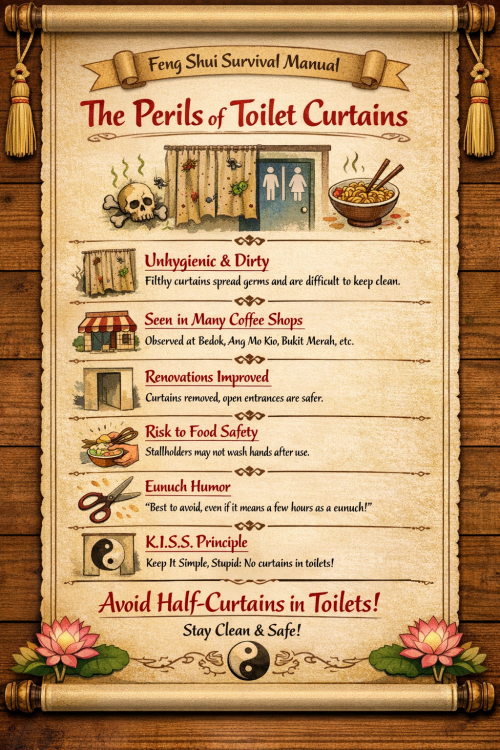 Curtains at toilets are unhygienic: The author repeatedly observed half‑curtains or fabric screens at coffee shop toilets in Singapore. They were often dirty, collected germs, and posed risks when touched or brushed against. Examples of poor hygiene: Multiple visits across years (2012–2023) highlighted filthy curtains at different coffee shops (Bedok Reservoir, Ang Mo Kio, Bukit Merah, Bukit Batok, Punggol Waterway). Fabrics concealed bacteria and were rarely cleaned. Renovations improved conditions: Some venues later removed curtains entirely, opting for open entrances or other designs, which eliminated the hygiene concerns. Broader concern: The author linked curtain hygiene to food safety, noting stallholders may not wash hands after restroom use, raising risks for customers. Humorous commentary: At times, the author joked about avoiding toilets with curtains (“becoming a eunuch for a few hours”), underscoring personal discomfort. General advice: Curtains—like dropped food under the “three‑second rule”—can quickly become contaminated. The recommendation is to avoid such barriers altogether, following the principle of K.I.S.S. (Keep It Simple, Stupid). Key takeaway: Installing half‑curtains in toilets is strongly discouraged due to hygiene risks, unpleasant experiences, and the difficulty of keeping them clean. +++ Location: Bedok Reservoir Village, Block 744 Bedok Reservoir Road, August 2012 1. Key: filth; disgustingly dirty 2. Today, I visited a coffee shop on Bedok Reservoir Road. 3. To access the toilet, you had to pass through a set of curtain screens. 4. I noticed that these two curtain screens looked very dirty. 5. These curtains can collect some of the most unpleasant germs. 6. The idea that people have to touch them is alarming! If your face happened to brush against them, the protective oil on your skin could be affected. 6.1. Just look at the fabric—so filthy. Yuck! 7. Even our computer keyboard is quite dirty; think of what happens when people don’t wash their hands after using the toilet. 8. Germs multiply quickly, and it’s not as if these curtains are cleaned daily or even weekly. Appended by Cecil in 2017: Good news! I went back to this coffee shop five years later, and the place had been fully renovated. The unpleasant curtain screens were gone, replaced by a simple opening to the toilet. K.I.S.S. = Keep it simple, stupid Update: From 2020 onwards, the coffee shop has undergone extensive renovations. All those issues are long gone.