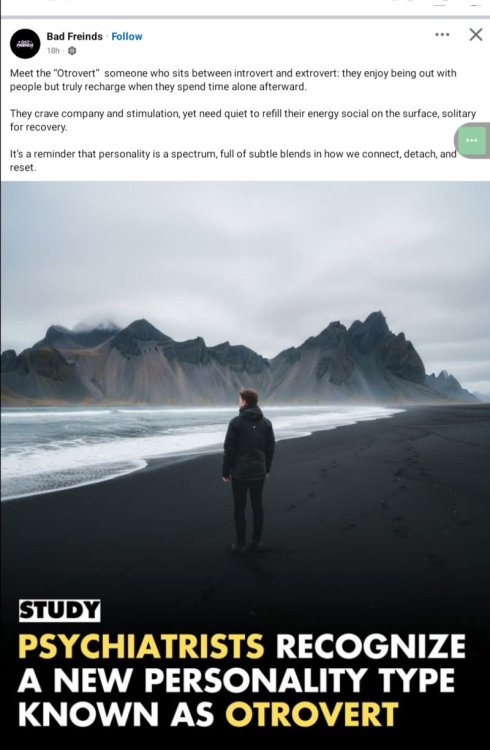 The otrovert" personality is described as a blend of both extrovert and introvert traits, similar to what is commonly known as an ambivert. Key Points about the Otrovert Personality: - Flexible Social Preferences: An otrovert is comfortable navigating both social and solitary environments. They can enjoy group activities and lively interactions but also appreciate and seek out time alone for reflection or relaxation. - Balanced Energy: Otroverts may feel energized both by social events and quiet, personal downtime. They aren’t defined strictly by a need for constant company (like extroverts) or isolation (like introverts). - Adaptive Behavior: Depending on context, mood, or surrounding people, otroverts may act outgoing or reserved. Their behavior may shift naturally, allowing them to fit into various social situations with ease. - Self-Awareness: Otroverts are often aware of their needs for both stimulation and solitude. They recognize when they need connection or when it’s time to recharge alone. Comparison to Other Personality Types - Extrovert: Seeks energy from being around others, prefers social participation. - Introvert: Gains energy from being alone, values private time. - Otrovert/Ambivert: Thrives in both scenarios, demonstrating adaptable social preferences. In Summary An Otrovert personality is someone who isn’t fully an introvert or extrovert, but rather displays characteristics of both—showing flexibility in their social interactions and personal energy management.