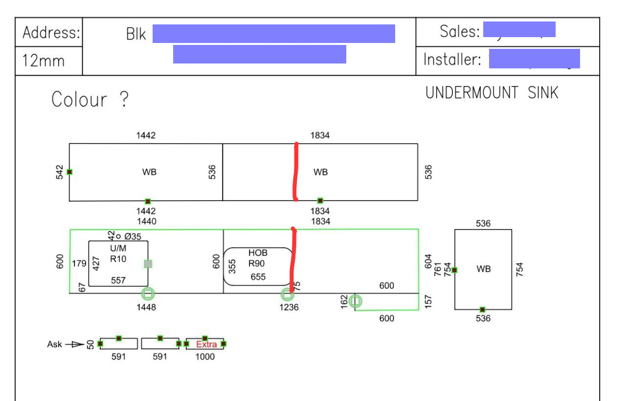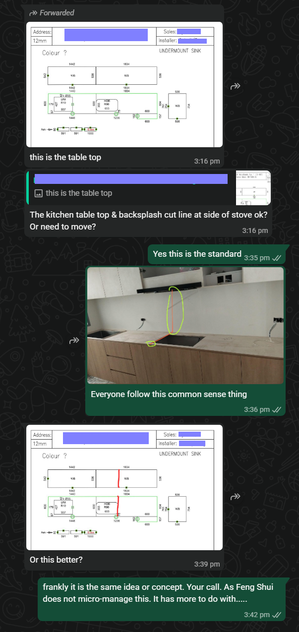 This resource has a dose of common sense No need for a degree in common sense, as it’s free! Question: for the joint line of the countertop, let's go with aligning it with the cooker. This is the best place to have joint line since the visible lines will only be at the green circled area. Cecil Lee's Reply: Yes, it’s common practice because it looks less noticeable, especially around the tabletop area. More The kitchen table top & backsplash cut line at side of stove ok? Or need to move? Everyone follow this common sense thing frankly it is the same idea or concept. Your call. As Feng Shui does not micro-manage this. It has more to do with.....