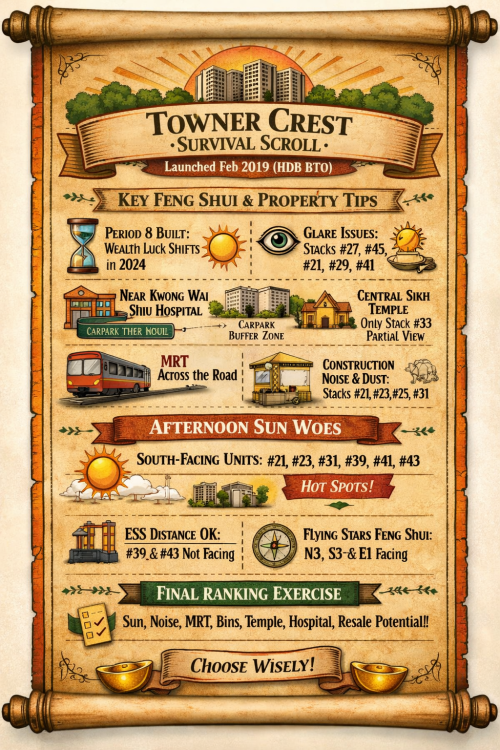 Here’s a distilled summary of the main points from this page on HDB Towner Crest BTO (launched Feb 2019): 🔑 Key Feng Shui & Property ConsiderationsCompletion Period: Built under Feng Shui Period 8; wealth luck changes expected from 2024 onwards. Glare Issues: Certain stacks (e.g., #27, #45, #21, #29, #41) may face glare or visibility into neighboring service yards. Hospital Proximity: Kwong Wai Shiu Hospital nearby. Developers placed car parks and pavilions as buffers. Some stigma exists about homes facing hospitals, though impact is limited. Temple Proximity: Central Sikh Temple considered in planning; only stack #33 has partial view. Roof design poses no Feng Shui risk. MRT Station: Entry/exit across the road is beneficial; underground tracks pose no Feng Shui issue. Construction Noise/Dust: Stacks #21, #23, #25, #31 closest to future high-rise site may face 2–3 years of dust/noise. Site History: Formerly schools (McNair, Griffiths, later ITE Balestier and MINDS Towner Gardens). Redeveloped into BTO. Hospital site unchanged since 1966. Afternoon Sun Exposure: South-facing units inevitably get indirect afternoon sun. Stacks #21, #23, #31, #39, #41, #43 most affected. Heat absorption may require mitigation (e.g., UV-blocking window films). Electrical Sub-Station (ESS): Safe distance; stacks #39 and #43 not directly facing ESS. Low-ball resale offers should be disregarded. Flying Stars Feng Shui: Most 4-bedroom units face N3 or S3; stacks #33 and #35 face E1. Ranking Exercise: Detailed A–Z criteria used to rank units, considering sun exposure, noise, rubbish bins, MRT proximity, temple/hospital views, and resale prospects. 🏠 Overall TakeawayTowner Crest BTO is strategically buffered from hospital and temple influences, but unit-specific factors like glare, afternoon sun, and construction noise play a big role in Feng Shui and livability. Historical context shows the site’s transformation from schools to residential use, with careful planning to mitigate negative externalities. +++ Part 1: Resources Towner Crest Sales Brochure: Site Plan and Floor Plans towner-crest.pdf Based on the above Estimated Completion Date, under Flying Stars Feng Shui; this development would have been completed under Period 8. But when we prepare an individual Feng Shui Chart, will certainly discuss especially the wealth luck also from 2024 onwards, due to a change of Qi.- HDB Kallang Breeze BTO launched in February 2019 - Which units are lucky?