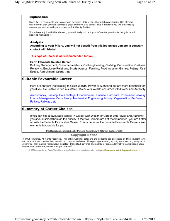 In the field of Strategic Management: There is: 1. The Industry one is in 2. One's CORE job function. What's wrong with someone working in a Metal element industry e.g. Banking and finance or Wood element e.g. Investment And one also is a Sales consultant = Fire element. There is nothing wrong in a two combination interpretation. For example: Metal with Fire or Wood with Fire combinations. In this sample "Mr Bazi's report" there is reference to each person: 1. Career with Wealth 2. Carrer with Power and Authority and 3. Other Suitable Careers. Here, there is such a thing as working in an industry that gives that individual "Power and Authority" e.g. can rise to the highest rank in a specific industry. Plus if the career follows the individuals "Career with Wealth" thus not only does this person has "Power and Authority" but also great wealth. +++ In Summary In the realm of Strategic Management, two key elements to consider are the industry one operates in and one's core job function. Working in a Metal element industry such as Banking and Finance or a Wood element industry like Investment is not inherently problematic. Additionally, being a Sales consultant falls under the Fire element. Combinations of two elements, such as Metal with Fire or Wood with Fire, are perfectly acceptable interpretations. In "Mr. Ba Zi's report," each individual is assessed in terms of their career with wealth, career with power and authority, and other suitable career paths. It is possible for someone to work in an industry that grants them power and authority, allowing them to reach the highest ranks. If their career aligns with the "Career with Wealth" aspect, they not only possess power and authority but also enjoy significant wealth. +++ Extract of "Mr Ba Zi's sample report:- -