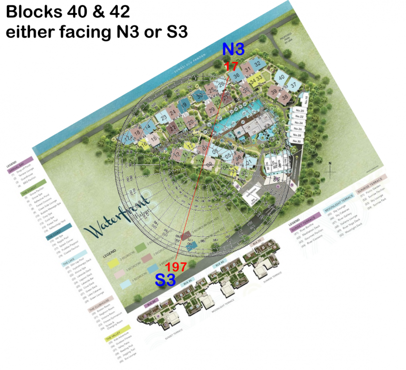 Waterfront @ Faber by World Class Land Pte Ltd Blocks 40 & 42: either facing N3 or S3 Under Flying stars; there is a difference between a N3 facing vs a S3 facing chart. Here, under N3 facing; the combined auspicious wealth stars are wasted at the rear of the home. Here, "rear" often means wasted at the kitchen / yard area in stead of at the frontage like that of an S3 chart. N3 and S3 stacks are the best stacks for a East group person. As both frontage enjoys the double auspicious #8 wealth stars. And furthermore their facing directions has water. Bring great wealth. The only concern for a S3 facing chart is that so often, the kitchen may be located at NW sector. Which in Feng Shui is called: "Fire at Heaven's Gate". And this can affect the male breadwinner's career luck. Thus for a South facing (S3) best to select a unit where the kitchen is either at North or North-east sector is preferred.