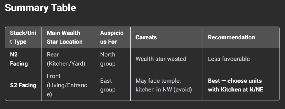 Gem Residences @ Toa Payoh Flying Star Feng Shui Gem Residences comprises of two blocks of flats. Both blocks are situated beside a temple complex. These two blocks are aligned in a North-South purecardinal points of 0/360 vs 180 degrees. Thus all stacks in this development are either N2 or S2 facing directions. N2. Stacks/Units such as1, 2, 3,8, 9, 10, 11 & 16 has the double auspicious #8's wasted at the "back"/rear of the unit. Thus not as favourable as compared with S2 facing stacks. S2. Stacks are the best stacks for a East group person. Plusthe frontage enjoys the double auspicious #8 wealth stars. Thusbased onFlying Stars the better stack isstack #15. Only disadvantage of stacks 15, 12, 13 & 14 are that they are able to see or view the temple fringe. Many would try to avoid this - if possible. 1. Attached, please find a sample illustration of a Flying Star Period 8, S2 chart. 2. In the attachment: it is advantages for the [8] & [8] which symbolises : Prosperity, good wealth at the frontage of the home. Vs a N2 facing where this good stars are wasted at the "rear" which is usually the kitchen/yard area. 3. The only concern for a S2 facing chart is that so often, the kitchen may be located at NW sector. Which in Feng Shui is called: "Fire at Heaven's Gate". And this can affect the male breadwinner's career luck. 4. Thus for a South facing (S2) best to select a unit where the kitchen is either at North or North-east sector is preferred. In Summary Certainly! Here’s a consolidated **Flying Star Feng Shui Analysis for Gem Residences @ Toa Payoh**: --- Gem Residences Overview - Location: Two blocks beside a temple complex. - Orientation: Both blocks aligned exactly North-South (0/360° and 180°). - Facing Directions: All stacks/units are either N2 or S2 facing. --- Facing Types & Impact N2-Facing Stacks/Units - Units: 1, 2, 3, 8, 9, 10, 11 & 16. - Flying Star Issue: The double auspicious #8 stars (Period 8's wealth/prosperity star) fall at the *back* of these units, typically affecting the kitchen or service yard area. - Result: Positive Qi (wealth, prosperity) is "wasted" at the rear, rarely utilised by main living and entrance spaces. - Recommendation: Less favourable compared to S2 stacks; suitable only when S2 stacks are not available or if personal Kua matches North group. --- S2-Facing Stacks/Units - Best For: East group persons. - Units & Special Mention: - Preferred unit: Stack #15 (double #8 stars at the frontage). - Other S2 stacks with good frontage stars: 12, 13, 14 & 15. - Frontage: Entrance/main windows face the auspicious #8 & #8 stars. - Benefit: Excellent potential for prosperity and wealth. - Caveat: These stacks may overlook temple grounds/fringe, which some residents may wish to avoid. - Layout Issue: Kitchen Position - If the kitchen falls in the Northwest (**NW**) sector, it is called "Fire at Heaven's Gate" in Feng Shui. This arrangement can weaken the career and status of the male head of household (breadwinner). - Solution: Opt. for units with kitchens in the **North or North-East sector** to avoid career and luck issues for the male resident. --- Flying Star Chart Reference (Period 8, S2 Facing) - Front Entrance/Main Window: Enjoys double #8 (wealth stars) at the front, ensuring best use of highly auspicious energy during Period 8 (ending 2024, but #8 remains positive until Period 9). - N2 vs. S2: - **N2:** #8 stars at rear—less beneficial as living areas do not receive the wealth Qi. - **S2:** #8 stars at front—living spaces, main entrance, receive the full wealth/prosperity boost. --- Recommendations for Gem Residences Buyers & Residents 1. Choose S2-Facing Units Over N2: Especially if you are an East group Kua person. 2. Prioritize Stack #15 & Similar: For maximum period #8 prosperity star at the frontage. 3. Kitchen Positioning: - Avoid kitchens in NW sector (Fire at Heaven’s Gate). - Prefer kitchens in North/North-East for best protection of male breadwinner’s career/health. 4. Temple Facing Consideration: Some may opt to avoid units facing the temple fringe, but from a pure Flying Stars perspective, S2 with #8 stars at the front is superior. --- --- In Conclusion: If you have a choice, select an S2 facing unit (especially stack #15) with the kitchen in North or North-East sector to maximize both wealth and career potential while enjoying the most auspicious Prosperity stars at the main entrance/living area. If you may need to match your personal Kua or further assess individual unit layouts (floor plans). -