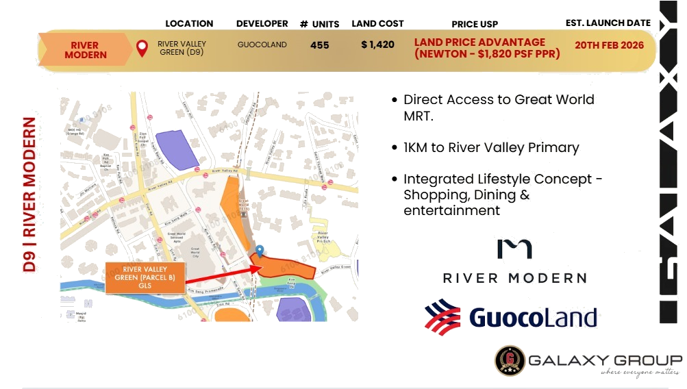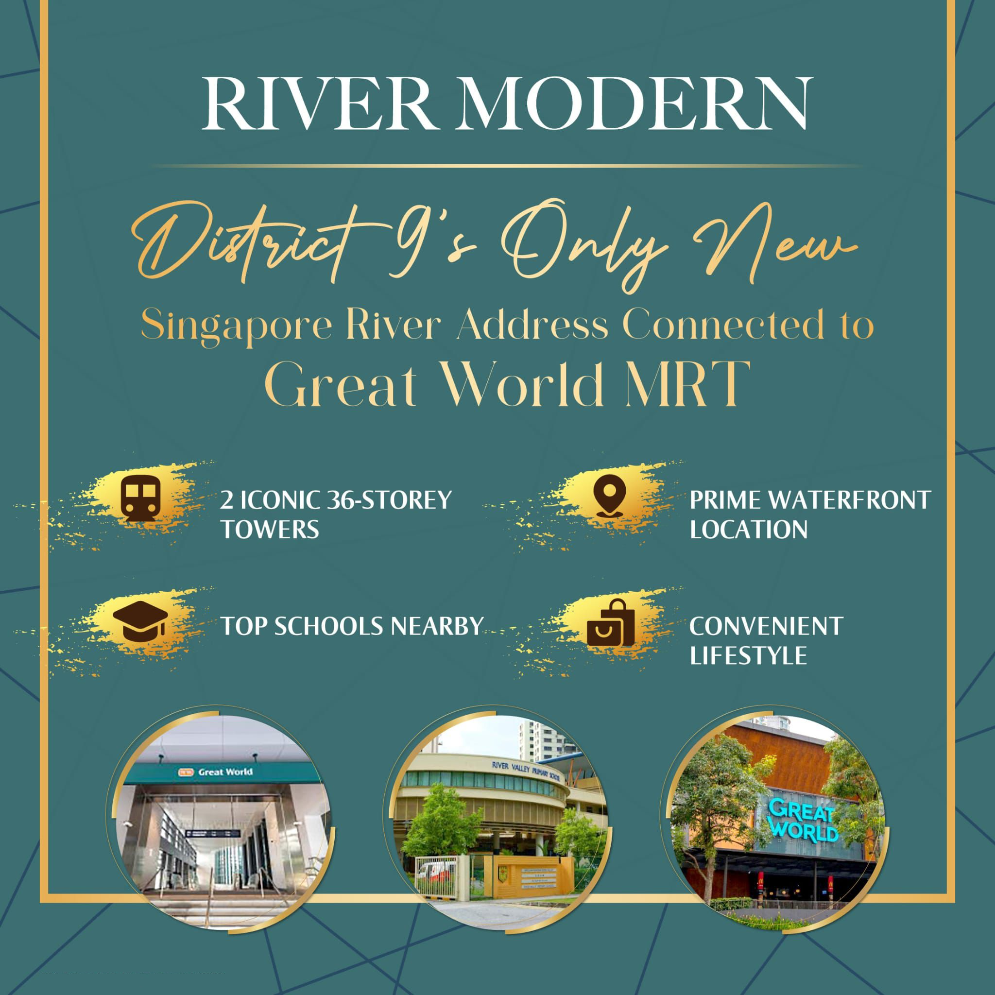 Staff Cecil Lee Posted November 12 Staff Share Posted November 12 River Modern Target Preview on 20th February 2026 Introducing RIVER MODERN @ River Valley A Landmark Integrated Development Bringing Modern Luxury to Life SHOWFLAT PREVIEW TARGET: FEB 2026 KEY HIGHLIGHTS Direct MRT Connectivity — Linked to Great World MRT Beside River Valley Primary School Serene Waterfront Setting Overlooking the Singapore River Seamless Access to Retail, Dining & Lifestyle Conveniences PROJECT INFO * Location: Core Central Region (D9), River Valley Green, 99 Leasehold * Integrated: Residential with Ground-Floor Commercial Space * Around 455 Exclusive Units | Twin 36-Storey Towers * Unit Mix: 2–4 Bedroom Residences with Private Lifts * Developed by GuocoLand Limited Link to post Share on other sites More sharing options...